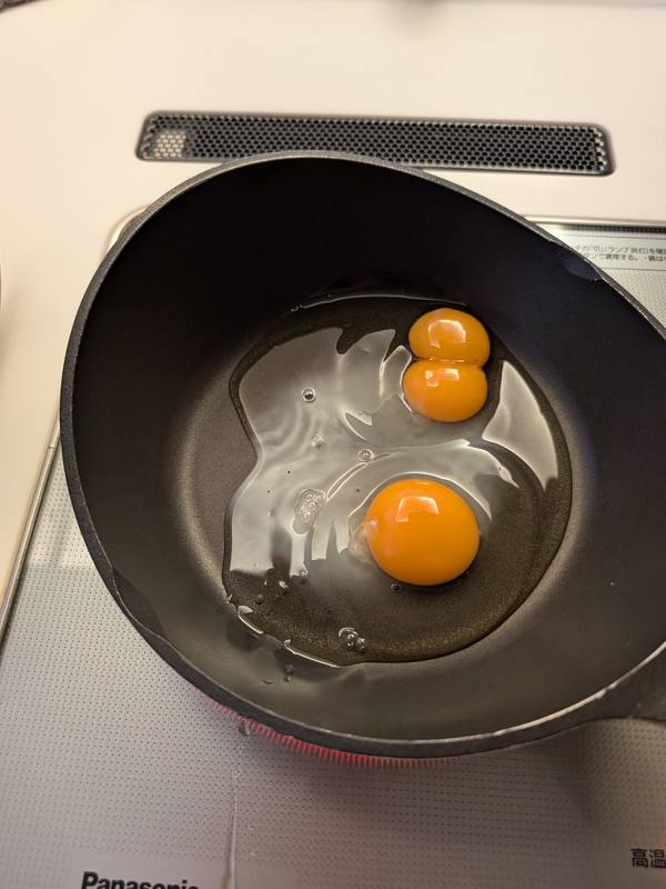 朝食を作るために卵を割ったら黄身が双子の卵がありました。珍しかったので写真を撮りました。2つ割って1つが双子です。2026年3月撮影